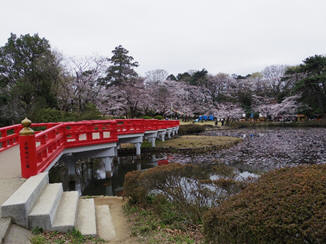 岩槻城址公園にある池には、ギザギザの橋が特徴的な朱塗りの八ッ橋が架かる